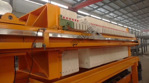 在液壓缸的作用下,壓濾機(jī)濾板沿主梁移動壓緊,使相鄰濾板間形成濾室,周邊密封。煤泥水經(jīng)人料泵以一定壓力從人料孔給人各濾室,借助人料泵的給料壓力在過濾介質(zhì)兩側(cè)形成的壓力差實現(xiàn)固液分離,煤泥顆粒滯留在濾室內(nèi),濾液透過過濾介質(zhì)從濾板的導(dǎo)水孔排出機(jī)外。經(jīng)過一段時間后,濾液不再流出,過濾脫水過程完成。停止入料,由鏈條拉開濾板,濾餅脫落后,由壓濾機(jī)下的刮板輸送機(jī)或膠帶機(jī)運走。